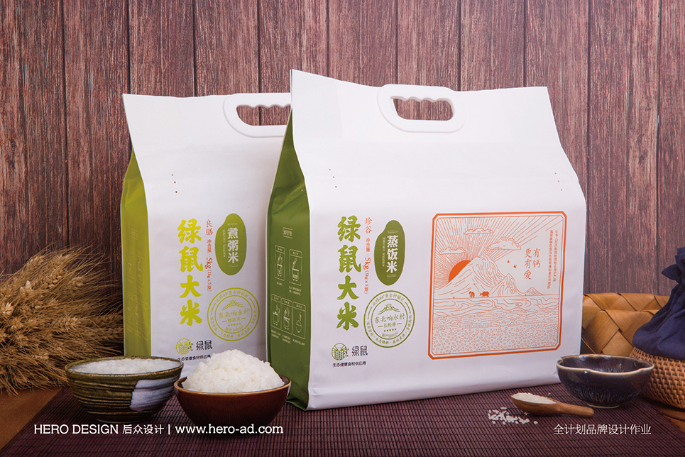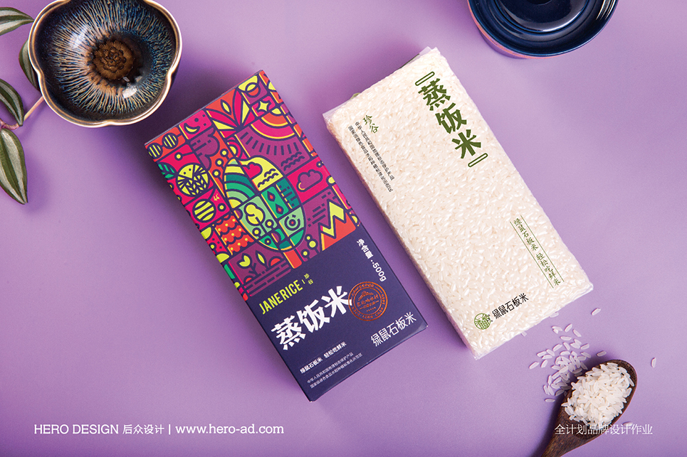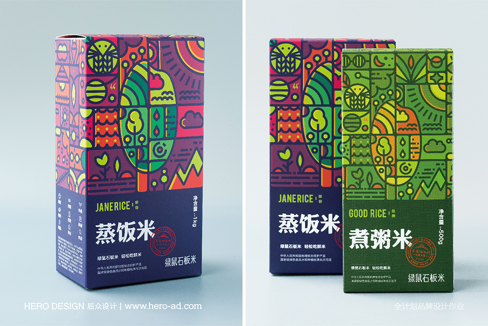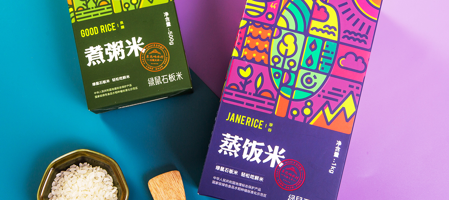 針對年輕人對于谷物產(chǎn)品的陌生感,結合90后、00后居家做飯時小食量、高品質的屬性,后眾設計與綠鼠食品共同開發(fā)出小容量時尚裝蒸飯米、煮粥米,以東北響水石板米為基礎,通過名稱的直觀表達消解年輕人的選購及蒸煮疑慮。整體包裝風格以插畫形式為主,通過各種扁平風格元素的搭配,傳遞出健康、自然、美味的核心內容。