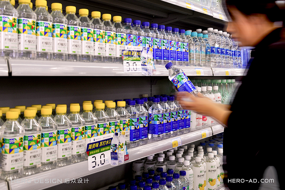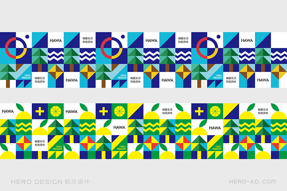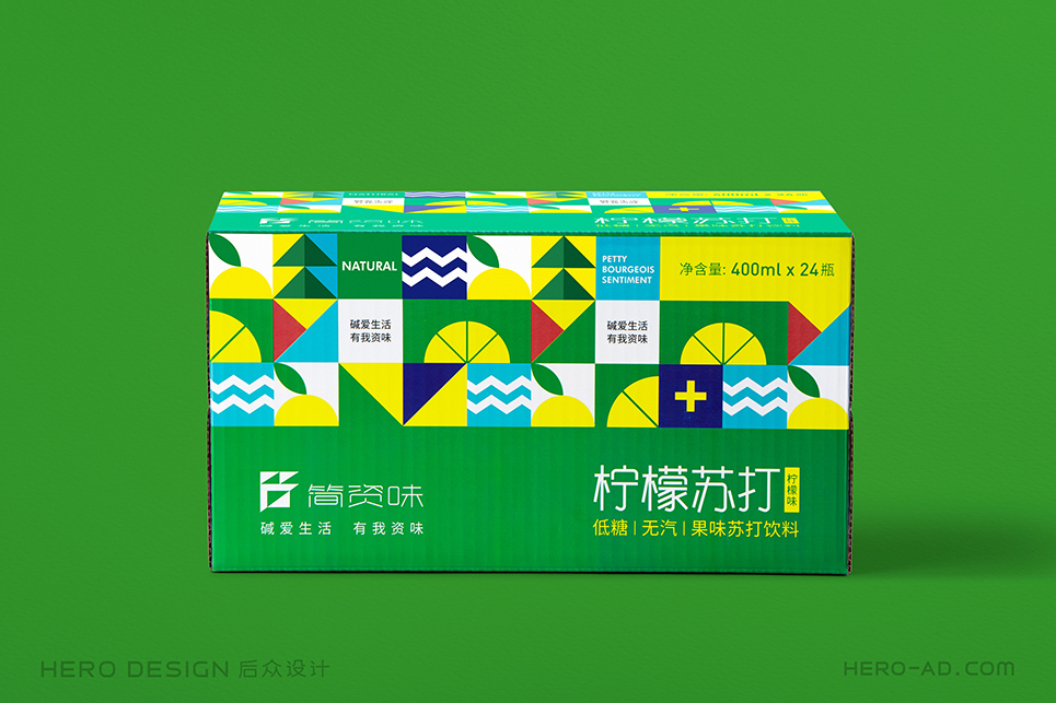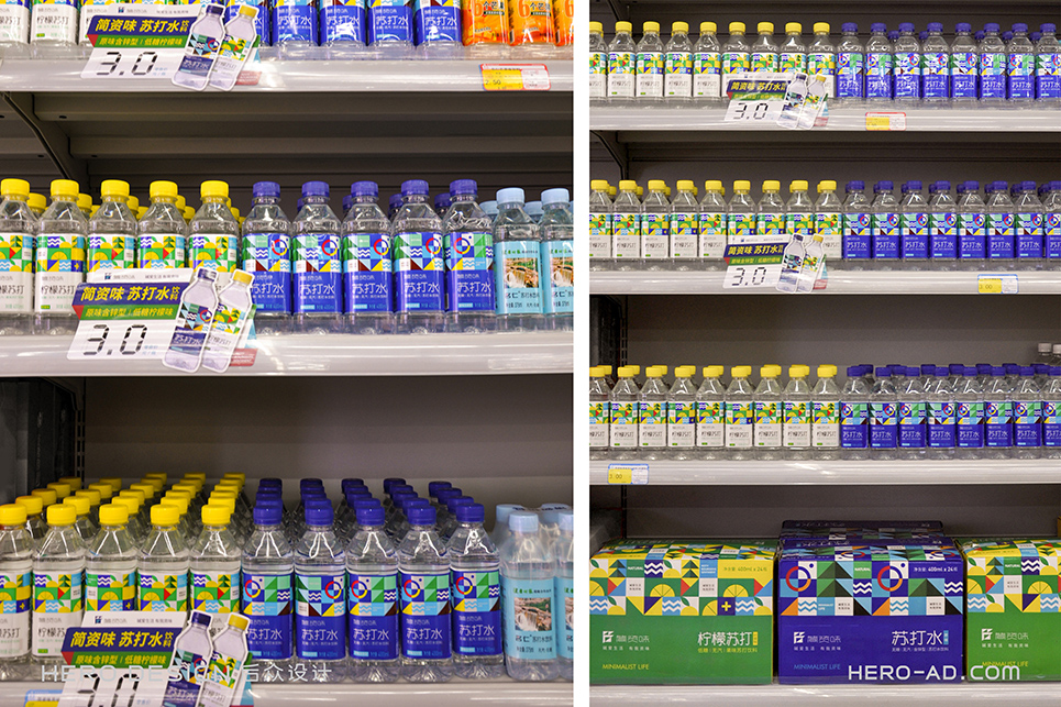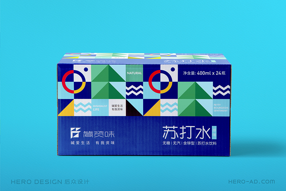 在包裝層面,為了貫徹“堿愛生活 有我資味”的生活觀,在標志所借鑒的至上主義表現(xiàn)形式中,結(jié)合簡資味蘇打水極致、簡約、自然、健康的品牌定位和目標消費者生活態(tài)度,將展示自然生態(tài)的相關(guān)元素融入其中,森林高山、原野河流、陽光云霧、海闊天空……通過對這些元素進行幾何化抽象處理,得到獨屬于簡資味的超級符號專屬圖形,并在所有的包裝、物料中一以貫之。最終與消費者形成共鳴,從而能夠使消費者對其產(chǎn)生獨特的情感利益,完成品牌忠誠度的打造。