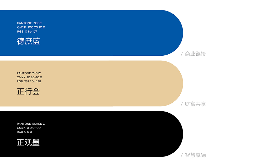 德庶商會的色彩體系設(shè)計以藍色為主色,配以金色與黑色,我們將其命名為“德庶藍”、“正行金”、“正觀墨”,將德文化的核心理念注入其中,充分展現(xiàn)出其商業(yè)鏈接、財富共享、智慧厚德的商會文化。一片藍色,傳遞出德庶商會在現(xiàn)代商業(yè)規(guī)律之下的突破與創(chuàng)新。