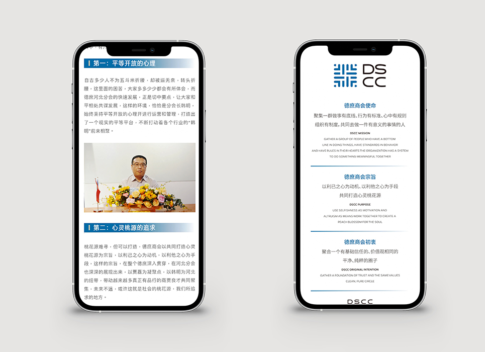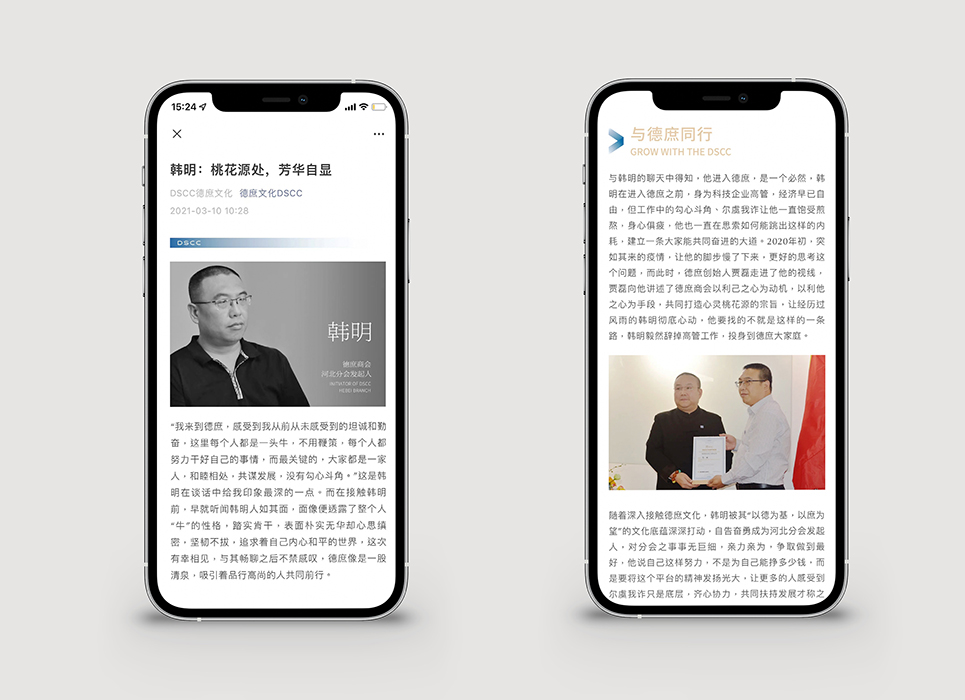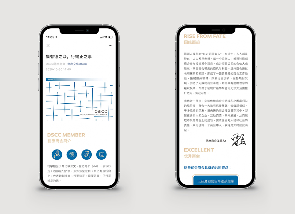 06 運用新媒體打造新商會在德庶商會創(chuàng)始初期,微信公眾號成為德庶文化在現(xiàn)實世界里突破空間限制、高效傳播的最佳方式。針對商會的特性,我們?yōu)槠湮⑿殴娞柾莆牡陌l(fā)布制定了相應(yīng)的視覺表現(xiàn)規(guī)范。