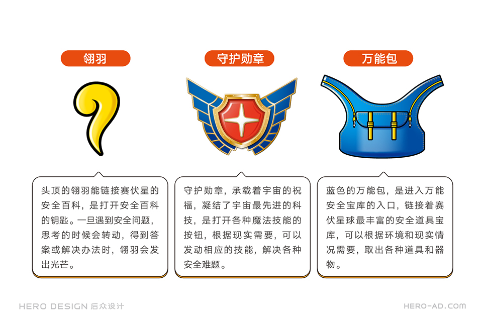 大安的背后,我們讓它背上了一個背包,命名為“萬能包”。在賽伏星球的世界里,藍色的萬能包,是進入萬能安全寶庫的入口,鏈接著賽伏星球最豐富的安全道具寶庫,可以根據(jù)環(huán)境和現(xiàn)實情況需要,取出各種器物和道具。