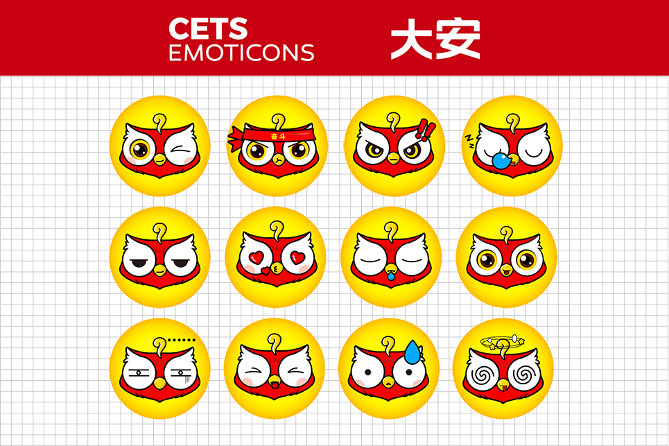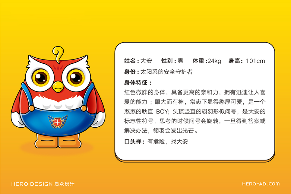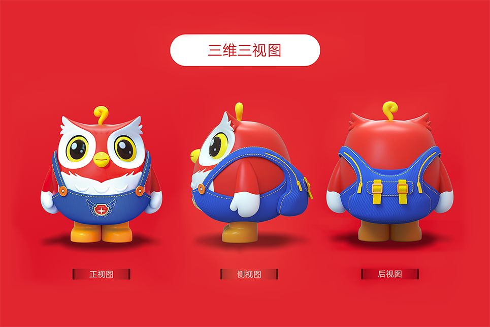 同時,我們基于安全教育的基本屬性,在創(chuàng)作構(gòu)思中,IP形象必須包含有溫暖治愈的特征,大安作為安全精靈,保護和治愈是它的使命,而整體體態(tài)就必須要帶一點萌,通過暖萌的形象與青少年產(chǎn)生情感共鳴、共振、共情。所以我們將大安的身體變胖了,還原了一個貓頭鷹應(yīng)有的胖,甚至略有一點肥肥的感覺,配合一雙超級大眼睛,形成一種巧妙的融合感,顯得非常和諧又溫暖。而紅色的身體傳承了電科安全的企業(yè)色彩,顯得異常醒目,同時也代表了對于危險的警示和提醒。