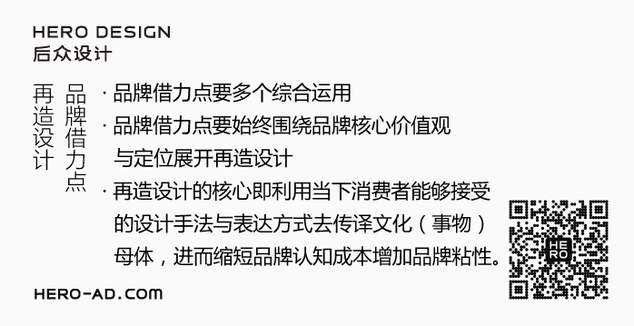 在進(jìn)行品牌借力點(diǎn)再造設(shè)計(jì)時(shí),還應(yīng)值得注意的一點(diǎn)是“當(dāng)代的設(shè)計(jì)手法與表達(dá)方式”。借力點(diǎn)只是文化(事物)母體,是公共舊有資產(chǎn),是經(jīng)過(guò)歷史沉淀下來(lái)的公共資源,而不是品牌價(jià)值的最終呈現(xiàn),針對(duì)“母體”我們要進(jìn)行再造設(shè)計(jì),而再造設(shè)計(jì)的核心是利用當(dāng)代或當(dāng)下消費(fèi)者能夠接受的設(shè)計(jì)手法或表達(dá)方式去傳譯我們的公共資源,本質(zhì)在于傳承與翻譯,文化(事物)可以是舊的,但表達(dá)一定是新的,只有這樣才能夠做到縮短消費(fèi)者對(duì)于品牌認(rèn)知成本的同時(shí)增加品牌粘性,吸引消費(fèi)者重復(fù)消費(fèi)。